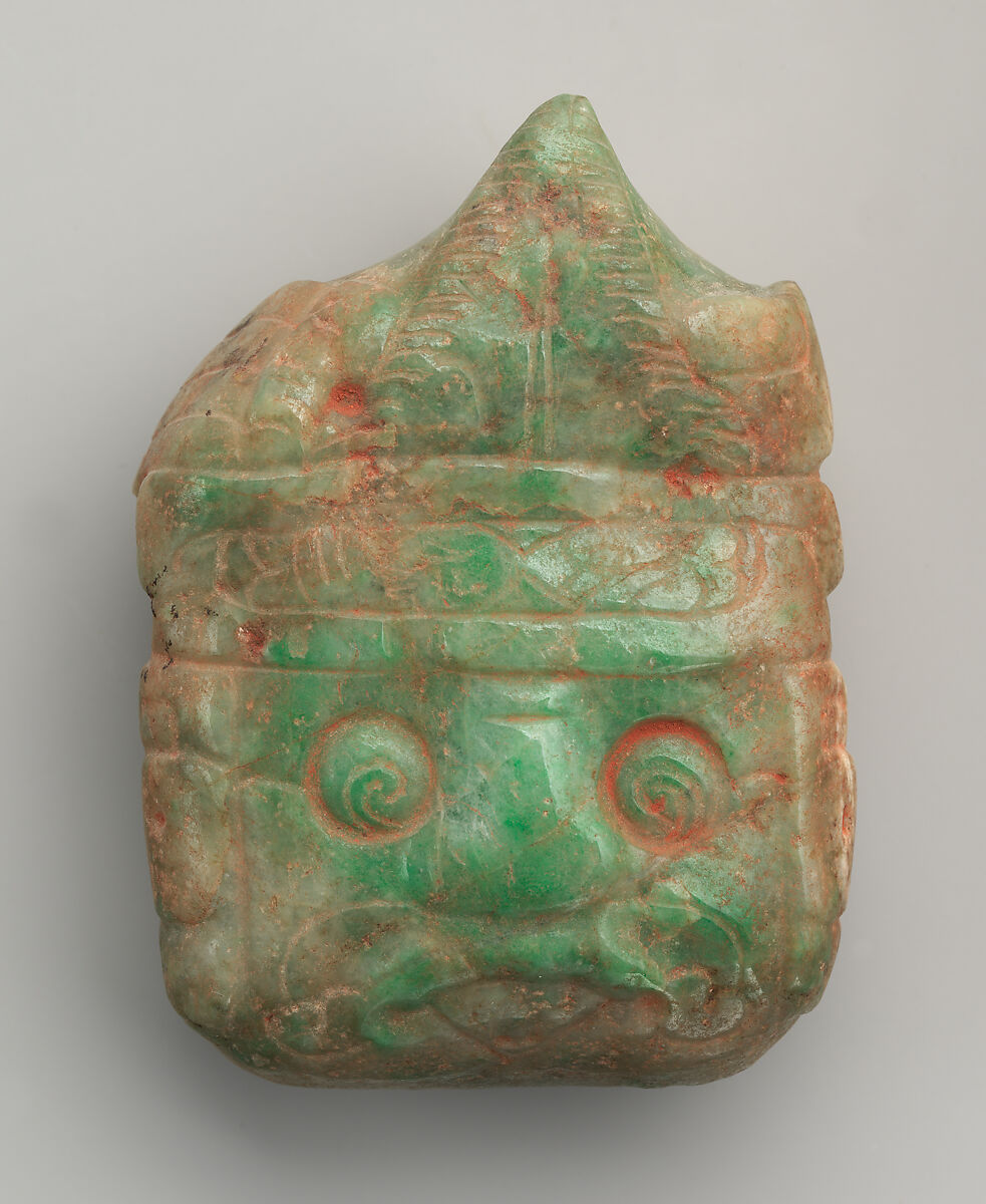 This jade pendant depicts a deity wearing a headband and a diadem composed of a stingray spine. The deity has prominent, bulging eyes with spiraled pupils. Under the bulbous nose is a downturned mouth, from which emerge two volutes from either side and a single shark’s tooth from the center. A headband is depicted as wrapped at least three times around the head of the deity. The central element of the diadem is a triangular shape that has a line running up its center and multiple incisions flaring towards the outer borders; this is a typical depiction of a stingray spine in Maya art.