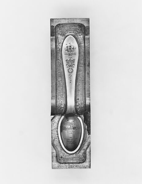 This die was used to form the upper portion of The Hudson-Fulton Celebration souvenir spoon of which there are four examples, 1983.134.1–.4, in the collection of the Museum. The rectangular die has a convex pattern for the front of the spoon with the design cut in intaglio. The die for the lower portion of the spoon, 1985.191.9b, is also owned by the Museum.