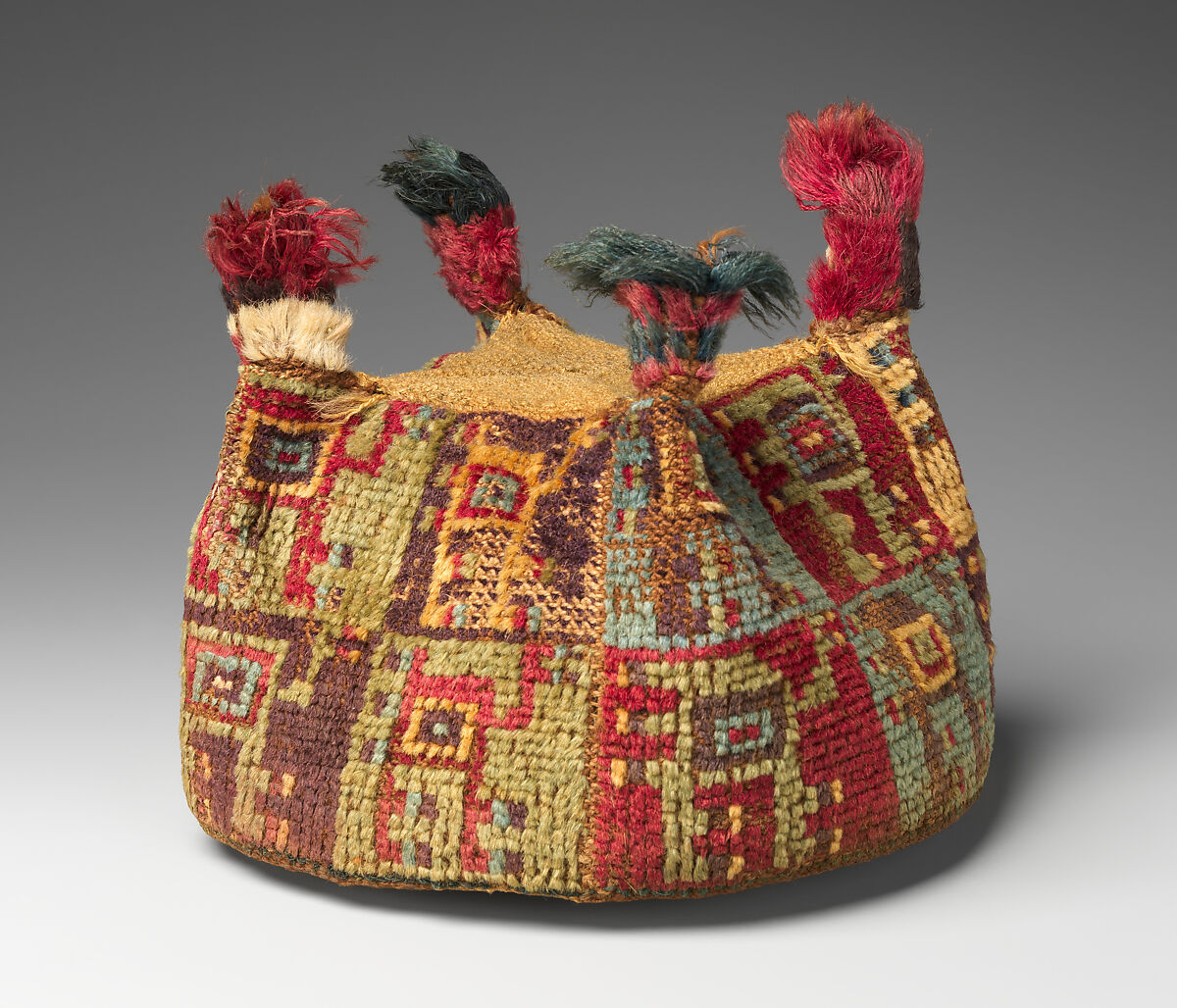 Finely woven, brightly colored hats, customarily featuring a square crown, four sides, and four pointed tips, are most frequently associated with two ancient cultures of the Andes: the Wari and the Tiwanaku. The Wari Empire dominated the south-central highlands and the west coastal regions of what is now Peru from 500–1000 A.D. The Tiwanaku occupied the altiplano (high plain) directly south of Wari-populated areas around the same time, including territory now part of the modern country of Bolivia. The cultures not only developed and flourished as contemporaries, but also occupied adjacent lands for nearly four centuries. A Wari ceremonial center called Cerro Baúl was located a mere five miles from Tiwanaku-settled fields in the Moquegua Valley of Peru. The two cultures likely encountered each other at Cerro Baúl and elsewhere, but the nature of these interactions remains largely unknown.