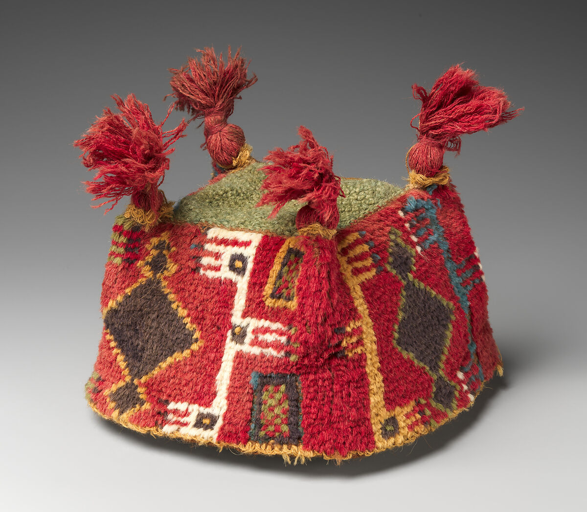 Finely woven, brightly colored hats, customarily featuring a square crown, four sides, and four pointed tips, are most frequently associated with two ancient cultures of the Andes: the Wari and the Tiwanaku. The Wari Empire dominated the south-central highlands and the west coastal regions of what is now Peru from 500–1000 A.D. The Tiwanaku occupied the altiplano (high plain) directly south of Wari-populated areas around the same time, including territory now part of the modern country of Bolivia. The cultures not only developed and flourished as contemporaries, but also occupied adjacent lands for nearly four centuries. A Wari ceremonial center called Cerro Baúl was located a mere five miles from Tiwanaku-settled fields in the Moquegua Valley of Peru. The two cultures likely encountered each other at Cerro Baúl and elsewhere, but the nature of these interactions remains largely unknown.