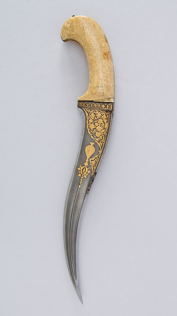 Although intended for ceremonial use, this dagger features discretely carved talismanic inscriptions of the kind found on arms and armor that were designed for battle. It bears a gold inlaid vase with flowers on both sides of the blade. Within the vase are Arabic inscriptions reading "Blessings from Allah" and "Victory from Allah."