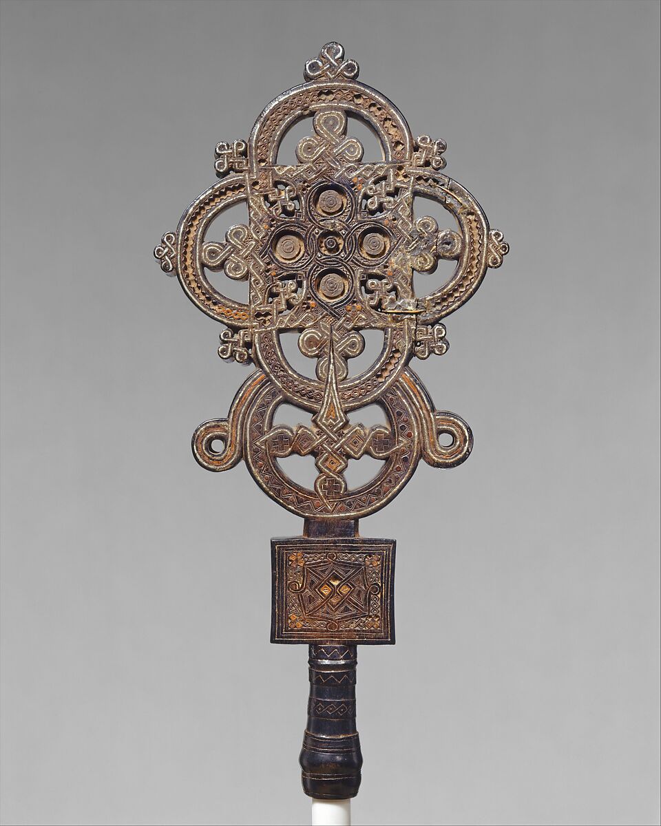 In the Ethiopian church, the wooden cross is perceived as having been sanctified by Christ's blood, which conferred upon it infinite power to heal and to bless. Foliate and organic interlace designs, branching from the foot of the cross, are interpreted as symbolizing the Tree of Paradise, and thus a vibrant life-giving force. Commissioned by Ethiopian royalty, such works were presented to important monasteries to be carried in liturgical processions.