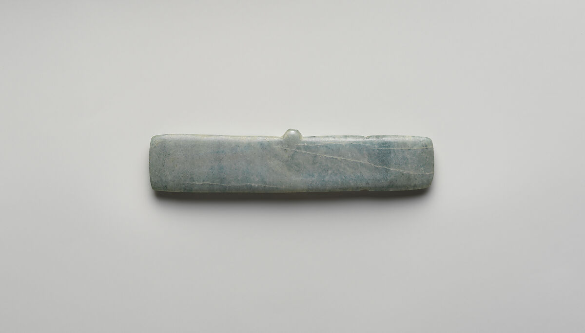 Winged pendants are found across a vast area from Mesoamerica to Colombia, including Costa Rica and Panama. Although the shape is extremely simple, the outline resembles an abstract representation of a bat with outstretched wings, hence the name ‘winged pendant.’ The small protuberance in the middle is perforated for suspension with a cord. A variety of materials was employed to make these pieces, such as jadeite, quartz, gold, and even ceramics. For example, this pendant was made from greenstone, a highly valued material in the Central Valley of Costa Rica before 800 CE. The style and dimensions of winged pendants (between10 to 15 cm long) are consistent regardless of the raw material used or where the pendant was made.
