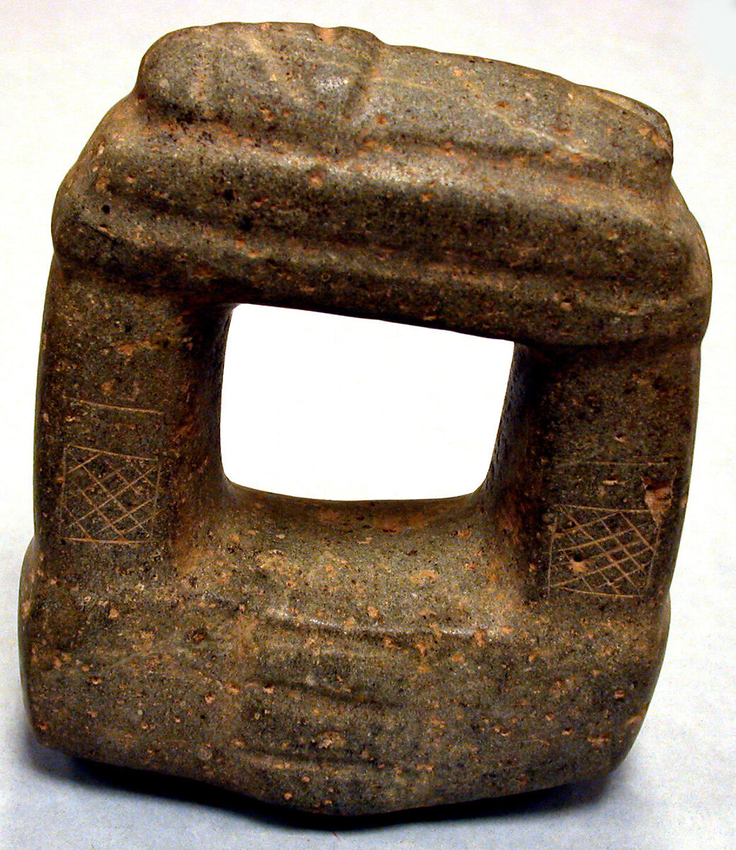 Mezcala models may have served multiple functions over time, in keeping with the Mesoamerican custom of repurposing or re-carving stone objects. Oblong-shaped models (see MMA 1994.35.704), or ones with curved bases (see MMA 1994.35.633), for example, may have been re-carved from celts, ritual tools of great symbolic importance. Several have holes drilled into the base, which could have been used to fasten them with fiber to a larger item such as a ritual bundle, a practice widely known in archaeological and ethnographic contexts in Mesoamerica (see MMA 1994. 35.700). Offerings of Mezcala stone objects in the Templo Mayor, the sacred center of the Aztec capital, Tenochtitlan, built between 1325 and 1519, underscore the importance of these works as a continuation of tradition, as heirlooms, or as emulations of an ancient style.