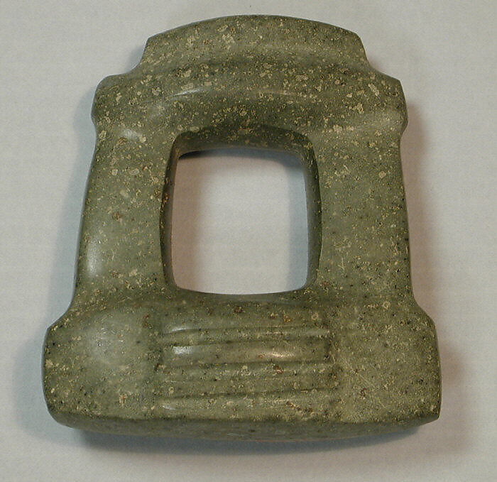 Mezcala models may have served multiple functions over time, in keeping with the Mesoamerican custom of repurposing or re-carving stone objects. Oblong-shaped models (see MMA 1994.35.704), or ones with curved bases (see MMA 1994.35.633), for example, may have been re-carved from celts, ritual tools of great symbolic importance. Several have holes drilled into the base, which could have been used to fasten them with fiber to a larger item such as a ritual bundle, a practice widely known in archaeological and ethnographic contexts in Mesoamerica (see MMA 1994. 35.700). Offerings of Mezcala stone objects in the Templo Mayor, the sacred center of the Aztec capital, Tenochtitlan, built between 1325 and 1519, underscore the importance of these works as a continuation of tradition, as heirlooms, or as emulations of an ancient style.
