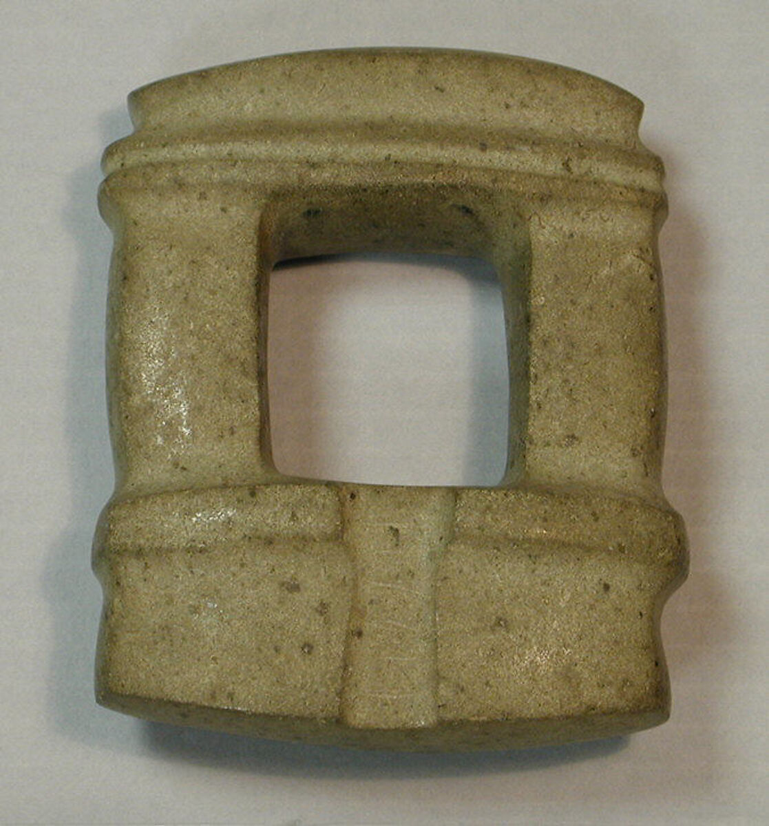 Mezcala models may have served multiple functions over time, in keeping with the Mesoamerican custom of repurposing or re-carving stone objects. Oblong-shaped models (see MMA 1994.35.704), or ones with curved bases (see MMA 1994.35.633), for example, may have been re-carved from celts, ritual tools of great symbolic importance. Several have holes drilled into the base, which could have been used to fasten them with fiber to a larger item such as a ritual bundle, a practice widely known in archaeological and ethnographic contexts in Mesoamerica (see MMA 1994. 35.700). Offerings of Mezcala stone objects in the Templo Mayor, the sacred center of the Aztec capital, Tenochtitlan, built between 1325 and 1519, underscore the importance of these works as a continuation of tradition, as heirlooms, or as emulations of an ancient style.