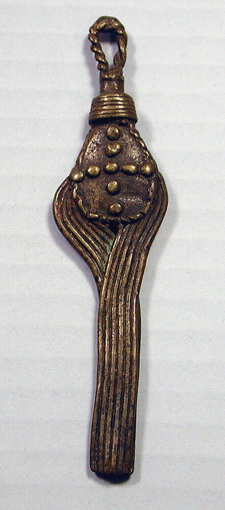 A miniature brass version of a type of royal fly whisk, made of gold-covered wood and tipped with the long tail hairs of a horse, is an item of regalia displayed by the king and other high-ranking officials of the Akan courts. Such amulets, constructed from Qur'anic texts folded and encased in leather, are evidence of the cosmopolitan nature of the Akan courts' engagement with the outside world through trade.