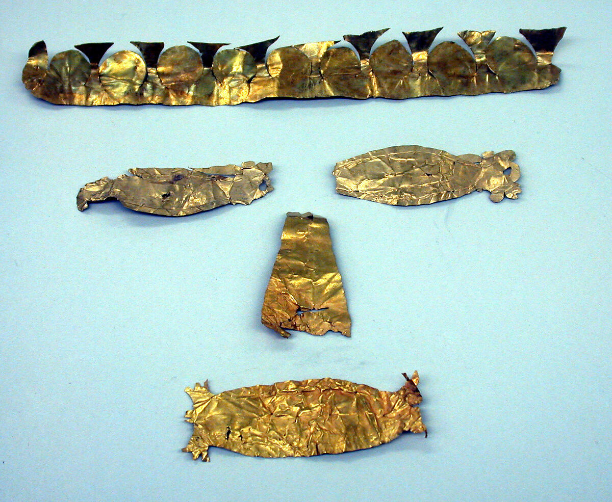 The Philippines have an ancient tradition of gold working. The existence of early mines suggests that gold deposits were already being exploited by the early first millennium B.C. Gold objects were often buried with the dead. Metalworkers fashioned gold foil covers for the eyes, nose, mouth, and other facial features, such as those seen here, which were likely used for individuals of high status. In the Philippines, this type of burial practice continued into the fourteenth and fifteenth centuries, particularly in the area of Oton in Iloilo province and on the island of Panay on the Visaya archipelago. Similar gold facial ornaments also have been found in prehistoric burials in Java, Bali, Sulawesi, and northern Borneo.