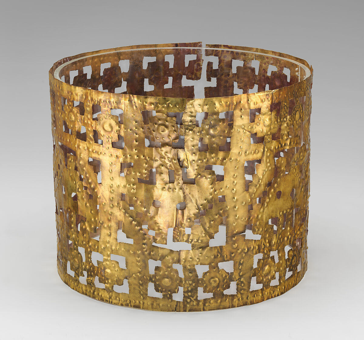 Las tumbas del periodo prehispánico en la costa norte del Perú, ubicadas en el interior o al costado de plataformas monumentales de adobe, podían albergar cantidades inimaginables de objetos elaborados con metales preciosos, conchas marinas y textiles. Coronas de oro, como esta, fueron halladas en Batán Grande, un gran centro ceremonial ubicado en el valle del río La Leche. Estas coronas fueron la base y soporte de grandes tocados que incluían materiales perecibles como plumas y telas. Junto a máscaras elaboradas en láminas de oro martillado (ver, por ejemplo, 1974.271.335, 1979.206.556) y otros objetos de metal, esta indumentaria imitaba la apariencia de la deidad Sicán, transformando a quien la portara en el protagonista de ceremonias especiales de las élites locales. El arqueólogo Izumi Shimada considera que estas coronas de oro también habrían sido utilizadas en la vida cotidiana, pero posiblemente solo acompañadas de algunos pocos ornamentos adicionales.