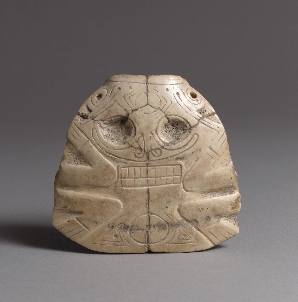 This bone pendant features a crouching figure with wide eyes and grimacing mouth, known as a zemí. Zemí (or cemí) is a term used by Taíno peoples, the diverse societies that inhabited the Antilles archipelago before European contact, that linguistically relates to a quality akin to sweetness. Zemí refers not to an object or image but to an immaterial, spiritual, and vital force pertaining to deities and ancestors. There are several known zemí identities recorded by the Spanish, some of which have been linked to archaeological images.