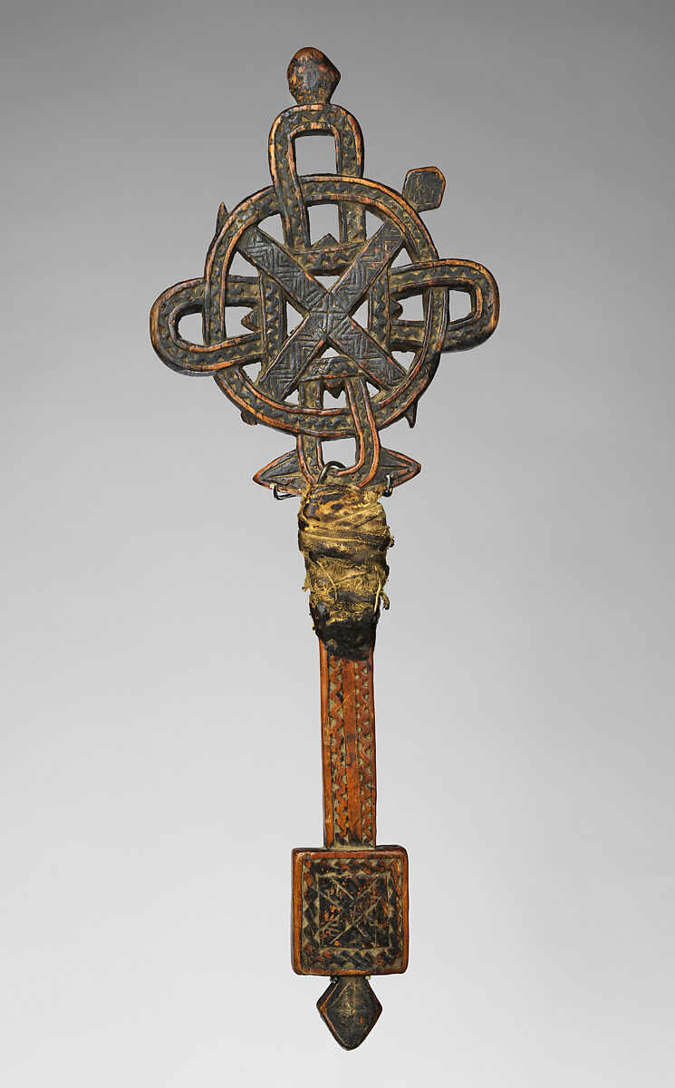 The squared cross—in which each of the crossbars is of equal length—is among the most common iterations of the form used in Ethiopian Orthodox art. Artist-monks created nearly infinite variations upon the shape, frequently employing multiple cross motifs within a single cross to emphasize its symbolic importance. This example of a wooden hand cross has at least three major crosses: one on the diagonal and two placed on axis, the smallest of which is enclosed within a diamond, and the largest of which is constructed of interlacing loops. The artist has articulated the carving so that the bands of each cross dip below and rise above one another, creating the illusion of a complicated woven design. The thick bands of the diagonal and looped crosses are filled with patterns of nested and single zig-zags, a motif that continues onto the grip and to the square at its base. A second diagonal cross divides the plane of the lower square, which would have remained visible while the cross was being held or presented during a blessing. While the interpretations of this square can vary regionally, it is most commonly interpreted as the tabot, an altar stone that is equivalent to the Ark of the Covenant. A lozenge shape projects from the square and the summit of the cross, creating compositional symmetry along the length of the object. Four smaller lozenges, of which only one remains, extend the form of the diagonal cross through its circular enclosure. The carved motifs are identical on either side of the cross.