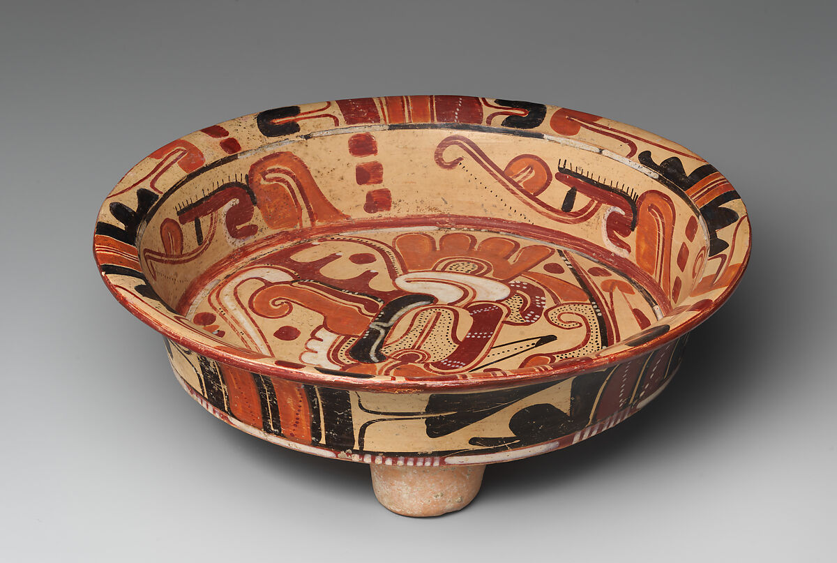 Boldly painted deities and zoomorphic creatures are the focal point of polychrome plates, bowls, and tripod vessels that were produced in the Sierra de Tuxtlas region of south-central Veracruz during the Late Classic period. Known collectively as Los Tuxtlas polychromes, the ceramic type is characterized by low-rimmed flat-bottomed bowls, with interior paintings in black, yellow, white, and sometimes orange, the central image providing a sharp contrast to the cream-colored background slip. Pairs of mirrored U and S-shaped elements frequently adorn the vessel sides. While archaeologist Michael D. Coe codified these traits in 1965, a photo of the first vessel fitting this description, from the site of Ranchito de Animas, was published in the late 19th Century by Hermann Strebel.