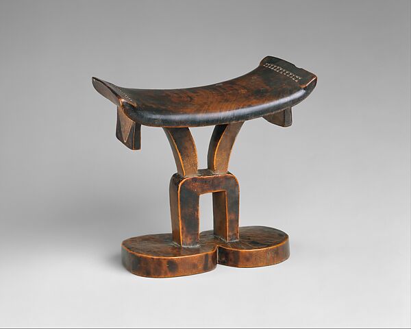 This headrest, like most others, consists of three basic elements: two horizontal planes joined by a vertical post. Tsonga artists have invested a great deal of creative ingenuity in designing the composition and structure of the supporting vertical post. This headrest's support is composed of a V-shaped bracket resting on a downward U-shaped form. The horizontal plane on top takes a slightly concaved, rectangular form and features incised geometric patterns along the surface edges. Included on the underside of the upper ledge are small pendant pieces known as ears or lugs. Lugs can take a number of different forms; in this case, they are square tabs positioned parallel to the main axis of the headrest. Nearly all Tsonga headrests have lugs, but not all headrests that have lugs are necessarily Tsonga. The base of this headrest is formed from two conjoined circular forms.