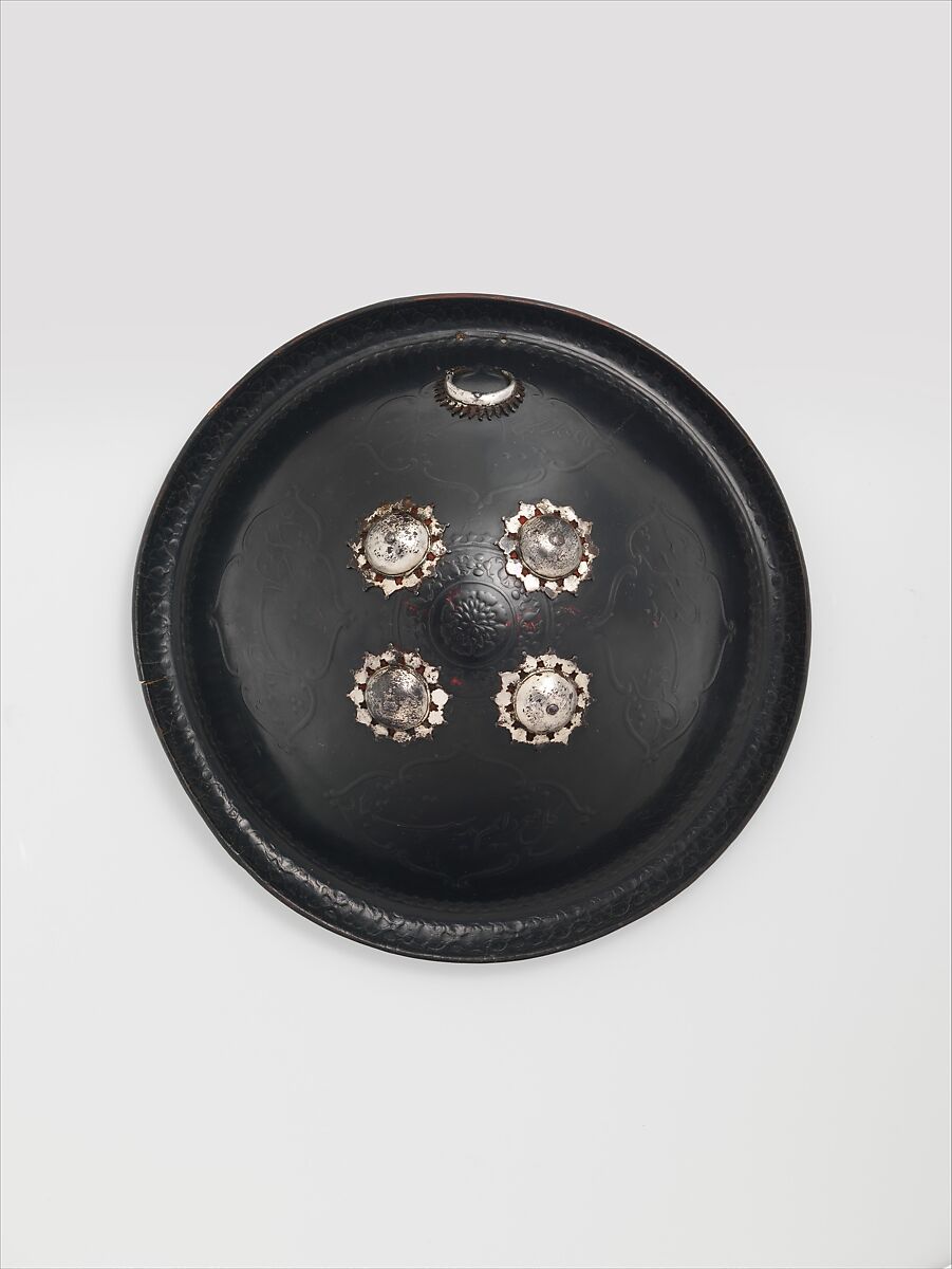 Shields of thick, extremely hard ox, antelope, or rhinoceros hide were often preferred in India over those made of steel. The small size of this example, with its deeply convex profile and turned-out edges that could snare an opponent’s weapon, suggests a date after about 1750. The black lacquered surface is decorated with raised medallions containing a Persian poem referring to “the garden of Bengal,” indicating that it was probably made in that province in northeast India.