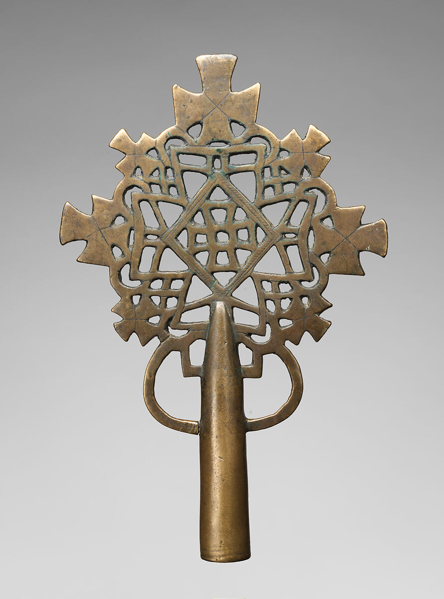 This ornately cast cross was originally positioned at the summit of a staff carried by an Ethiopian Orthodox Christian priest. The artist has created a symmetrical design that repeats the form of the cross ad infinitum, emphasizing its importance through repetition. The major motif is a pattée cross, a square cross with flaring crossbars of even lengths. At least three of these crosses nest within one another, the spaces between them filled with diamond and geometric interlace patterns. Seven smaller pattée crosses form finials to the crossbars and emerge from the diagonals, creating a rhythmic step pattern that expands and contracts around the perimeter. Images of Christ are rare in Ethiopian crosses, reflecting Ethiopian Orthodoxy's dual belief in the cross as a sign of the Crucifixion and the Tree of Paradise. Thus, the small pattée crosses sprouting from the summit and sides of the frame may allude to budding leaves. Small incised lines on the surface emphasize that the cross’s many motifs were meant to appear as intertwined elements, rather than as discrete sections of a cutout. An incised rope-pattern on the central diamond and x-shaped lines on three of the outer crosses give further depth while emphasizing the central motif. The juxtaposition of positive and negative space employed in the cross would have created a dramatic silhouette against the sky during an outdoor procession, or cast an imposing shadow during a candlelit service. The cross’s warm bronze metal—darkened at the top, and slightly at the shaft from handling—would have shimmered in the light. Openwork looped arms at either side of the shaft held colorful streaming textiles that represent Christ’s shroud or Mary’s veil.