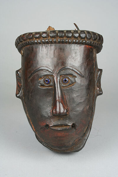 While the carver has devoted considerable attention to the face, including such details as a beard and moustache of actual hair, the exterior of the amulet was ultimately of less importance than its interior. The head is actually a vessel, open at the crown, whose cavity is filled with a range of supernaturally efficacious materials. Upon consultation with a diviner or healer, a combination of organic and mineral substances such as earth, bones, sticks, and seeds was tailored to the requirements of the amulet's owner and deposited inside. The amulet was then attached to a cord by two loops carved into the back and hung from the neck or waist, where it shielded its bearer from harm.
