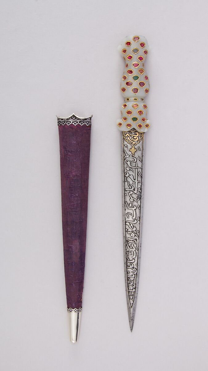 Like their martial counterparts, ceremonial daggers and swords were also often decorated with talismanic motifs and inscriptions. The blade of this dagger bears Arabic inscriptions praising Allah, ‘Ali, and the Prophet Muhammad. One side features verses from the popular prayer Nad-i ‘Ali. The inclusion of rubies and emeralds on the hilt may point to the Hindu belief in the efficacy of precious gems to ward off evil.