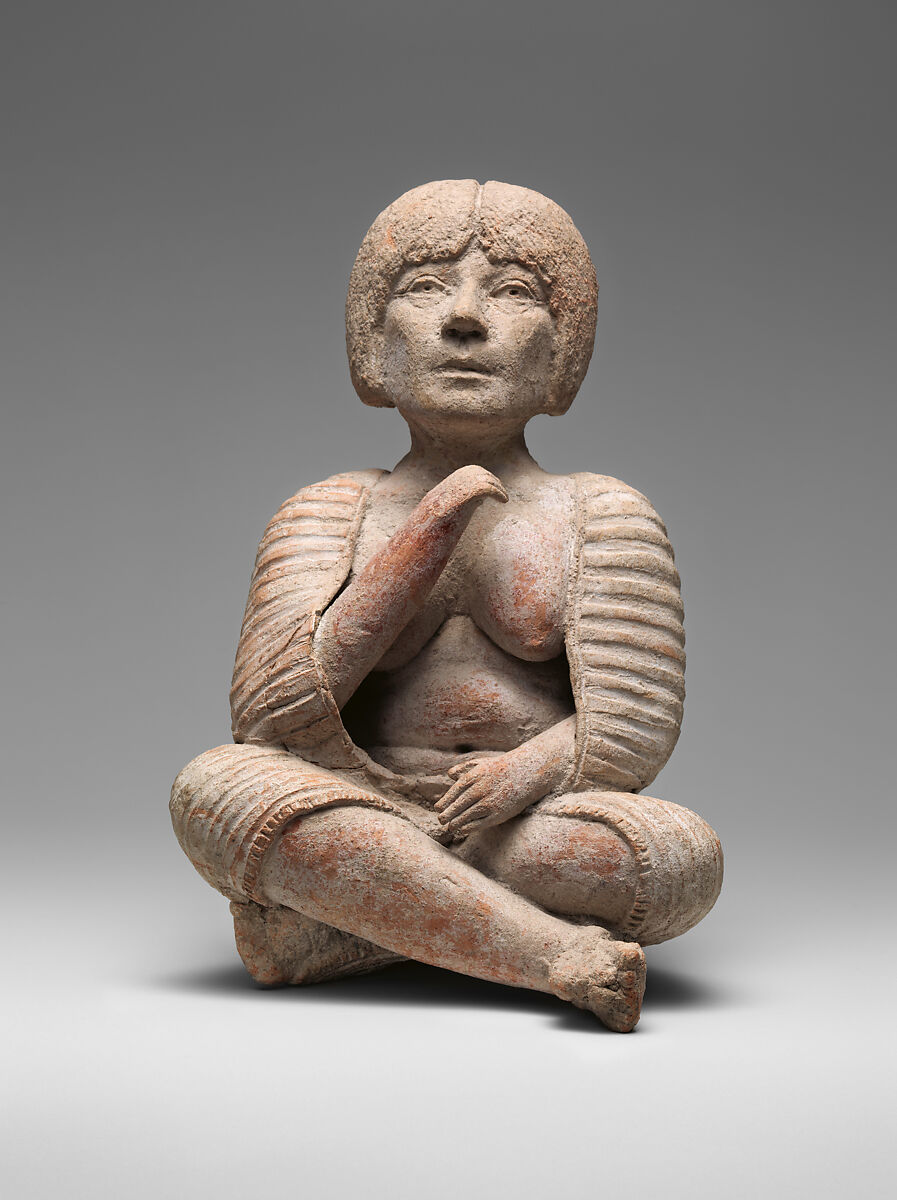This figure, made in the unusual Xochipala style, depicts a female seated with her legs crossed modeled in grey-colored clay. A full garment with horizontal stripes worked as evenly spaced grooves and a border indicated by fine incisions is draped around her body covering her shoulders and legs below her knees leaving her bare, full breasts and stomach visible. She raise one hand as if in mid-gesture. Her naturalistically rendered facial features with open eyes, large nose and thin closed lips show a serious expression. She has a full head of short hair indicated by striations parted in the center.