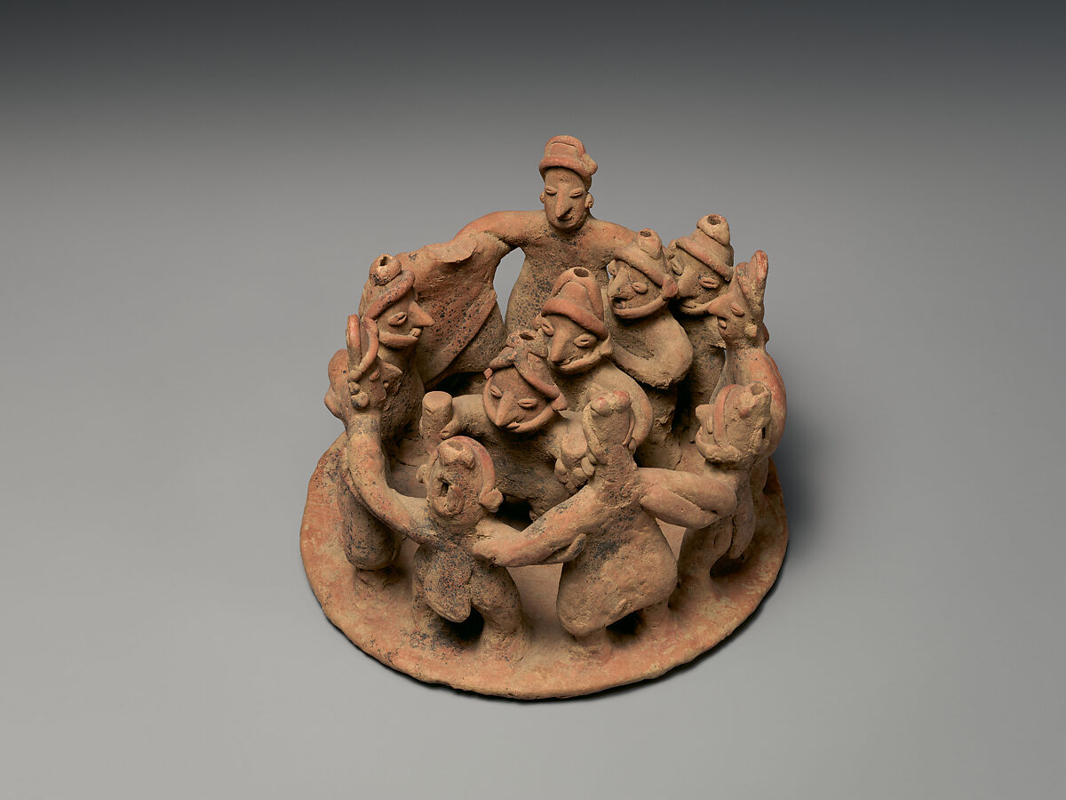 In this scene eight alternating male and female figures holding each other at the shoulders form a circle. The females are taller than the males; they wear headbands and long skirts wrapped around their hips; the males wear loincloths and chin straps. In the center of the circle are three male figures holding objects, possibly musical instruments. The heads of the females are solid clay while those of the males are hollow and appear to be whistles. The facial features of all figures are appliqued.