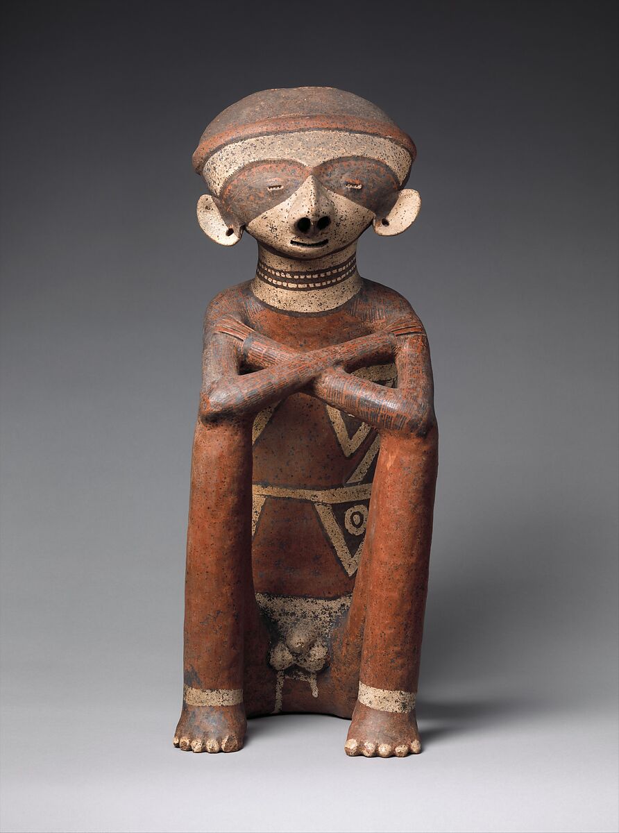 The figure in the Nayarit ‘Chinesco’ style depicts a seated male, nude except for jewelry and extensive body paint, his crossed arms resting on his pulled up knees. Across the forehead of his flattened head runs a raised band. His small eyes and mouth are shown as short horizontal incisions. His prominent broad nose has large nostrils and a perforated septum. The lobes of his ears also have holes. His face is white, but the eye area which looks like an eye mask, is red with small geometric motifs painted in black. He wears a multi-strand necklace on his neck also painted white. His torso, arms and legs are red, but the shoulders and arms have multiple rows with groups of short black lines. He wears white anklets and his toenails are also white. Around his torso are two wide horizontal registers with circles inside triangles painted in white and black.