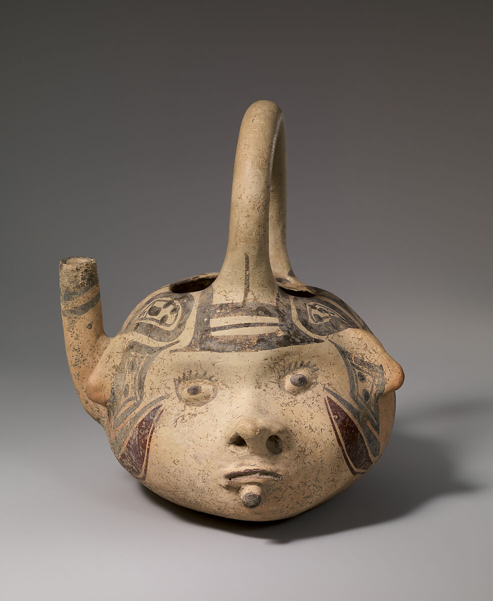 The vessel is in the shape of a human head with wide open, staring eyes, a small pug nose, and closed mouth. A lip plug is worn in the lower lip. A handle extends from the forehead to the back of the head. On the right side behind the ear projects a single spout pointing upward. On the sides of the face and back of the head the cream-colored surface is covered with geometric motifs including dots, circles, diamonds and crosses in dark brown and purple.