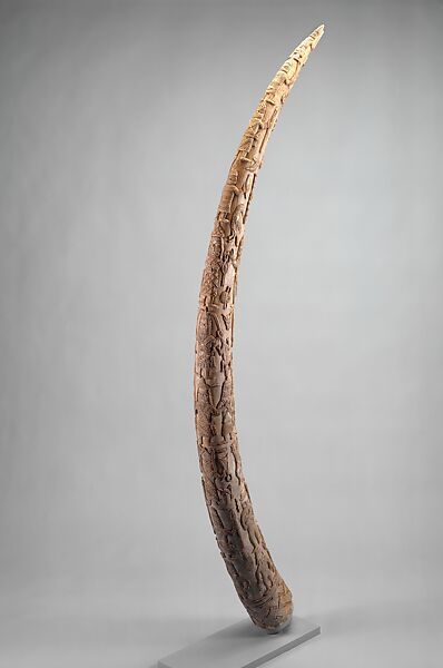 At its origins, the centralized city-state of Benin was founded by Edo-speaking peoples. The accounts by official court historians and descriptions provided by visitors evoke a vibrant cultural center continually redefined by its leadership through shifting internal and external power dynamics. According to oral tradition, circa 1300, Edo chiefs are reputed to have reached out to the leader of neighboring Ife, Oranmiyan, to establish a new divinely sanctioned royal dynasty. Since then, the investiture of Benin’s rulers to the title of obas has conferred upon them at once a role of chief priest officiating in important religious ceremonies and presiding over an elaborate structure of palace officials. During the fifteenth century reign of Oba Ewuare, Benin’s armies were formed and the fortification of its capital with a massive wall undertaken. In parallel, delegations of Portuguese traders assiduously sought to secure exclusive commercial treaties with this leader of the region’s most powerful polity. At its height in 1500, Benin’s authority extended to the Niger delta in the east and to the coastal lagoon of Lagos in the west. Its major exports of pepper, textiles, and ivory were exchanged for copious quantities of imported metals. This access to an influx of brass led to an explosion of creativity by court artists who transformed it into works for the palace ranging from ancestral portraits, positioned on royal altars, to decorative plaques depicting the oba, his courtiers, and foreign interlocutors. From the earliest such exchanges, those Europeans commissioned exquisite ivory artifacts from Edo carvers for princely collections back home.
