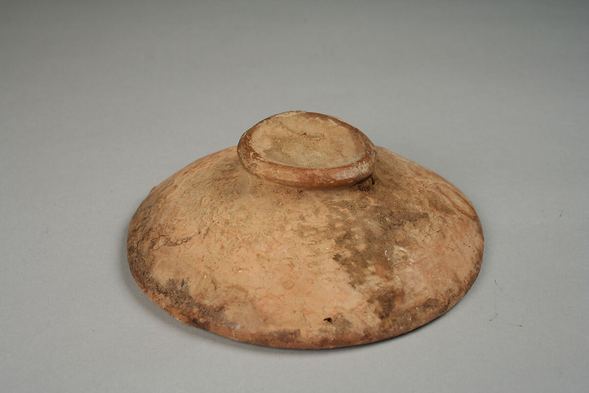 Three- and four-footed pottery bowls like this one have been found in caves directly below Tellem burial caves in the Bandiagara cliffs. Stylistically distinct from other forms of Tellem pottery, this type of bowl is believed to have been made specifically for funerary purposes. The brown and white specks on the base of this bowl, possibly from the sacrificial remains of funerary rites, may reflect this, although it is also possible that these are the result of more recent usage by the Dogon.