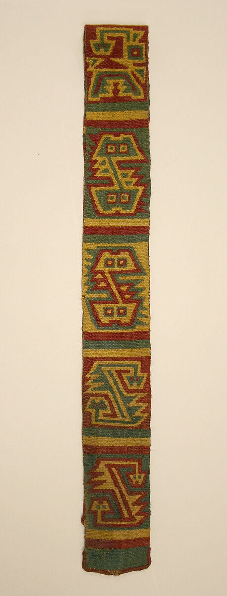 Ancient fabrics from the highlands of the Peruvian Andes rarely survive the adverse weather conditions that prevail there; this Recuay-style belt or chumpi, of extraordinary and complex elaboration, is a rare exception. The Recuay culture (A.D. 200–700) occupied the territory corresponding to the Callejón de Huaylas and the Callejón de Conchucos, a space between the Cordillera Negra and the Cordillera Blanca, in the North Central Andes of Peru. Its development was contemporary to the Mochica (also known as Moche) and Gallinazo cultures of the north coast; Cajamarca, from the northern highlands; and Lima, from the central coast, with whom they interacted from early times. Among these diverse cultures the Recuay stood out for the construction of mausoleum-like tombs and underground funerary galleries. They also created distinctive modeled ceramics, rich in ritual scenes. Some represent male and female characters who participate in rituals related to fertility; others depict battle imagery, including fortified spaces. Recuay artists also made monumental anthropomorphic lithic sculptures as part of a broader practice venerating ancestors, incorporating them into a community’s collective memory. The textile arts, in spite of the limited corpus, show a high technological development—one that distinguishes it from its contemporaries.