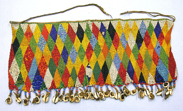 - Medium: Glass beads, cotton yarn, cowrie shells, metal (?)