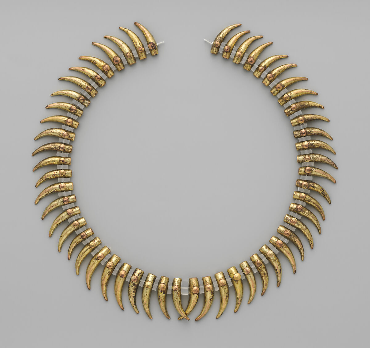 The fifty-four beads forming this necklace are cast of a copper-gold alloy known as tumbaga. The relatively high copper content in the alloy accounts for the pink tonality of the gold. The curved, pointed shape of the beads may represent animal teeth and or claws. A curious, unexplained feature is the projecting knob on top of each bead. The knobs may be ornamental or, more likely, may have had additional decorations such as colorful feathers or threads tied around them. Abrasions on the sides of the beads suggest that flat stone beads, about 1.5 centimeters in diameter, were once placed between the gold ones. The arrangement of the beads here is conjectural.