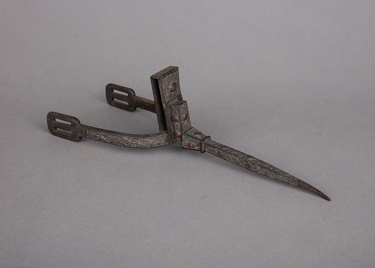 The prick spurs traditionally used in most of the Islamic world evolved directly from late Antique examples. They consist of straight U-shaped branches bearing a very long prick with sometimes a disc at its base. The flat loop at the top of the heel is used for attaching the strap going around the ankle. Here the latter and the left side of the spur are adorned with silver foil bands chiseled with vegetal scrolls and inlaid with coral cabochons, a type of decoration also found on Algerian Berber jewelry as well.