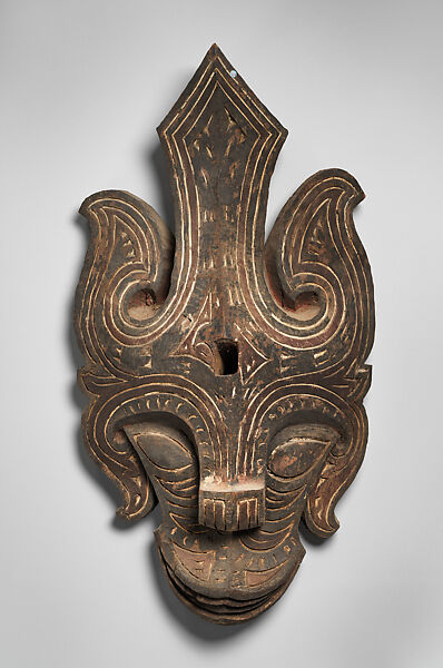This architectural ornament in the form of the head of a singa, is from a dwelling or rice barn of the Toba Batak people of northern Sumatra in Indonesia. Toba Batak peoples conceive of the singa as a composite animal and supernatural guardian. Carved in relief and painted in red, black, and white the singa has three horns: those on the left and right side curve slightly inwards with flaring semi-circular tips. The central horn extends straight upwards from the center of the forehead and ends in an angular, roughly arrowhead-shaped form with points at the apex and to each side. A rectangular hole, likely originally used for a peg or tenon that secured the ornament to the façade, is present on the forehead and extends completely through the piece at a downward sloping angle. The ears, brow ridge, and nose are rendered as a single fluid element whose form echoes the configuration of the horns above it. The eyes appear as lozenge-shaped forms in low relief and the mouth, its corners curving upwards in an expression resembling a smile, is shown at the base of the piece at the end of a short, flattened snout.