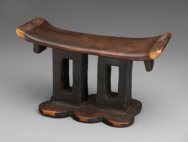 The rectilinear composition of this headrest is a format associated with Shona sculptors from northeastern Zimbabwe and extending partially into Mozambique. Northeastern-style headrests commonly feature a rectangular upper platform that is decorated on its slightly upturned edges. This example features a stripe of parallel incisions along the surface edge. Extending from the underside of both extremities of the upper platform are small tabs known as ears or lugs. The upper platform is balanced by a lower platform comprised of six abutting circular shapes. The central support of this headrest is comprised of two vertical columns that create a negative space between them and also feature blocks of negative space within the columns themselves. This format avoids the use of circular motifs in the supports, a common characteristic in other Shona styles. These rectilinear supports give the headrest a graphic composition and appearance that are marks of northeastern-style headrests. The work is carved from a single piece of dark brown wood. Its surface is now covered with a lustrous patina, reflecting many years of frequent use. Works like this Shona headrest, as well as the other southern African headrests in the Museum's collection, reflect the effort invested in the design of functional objects by southern African carvers.