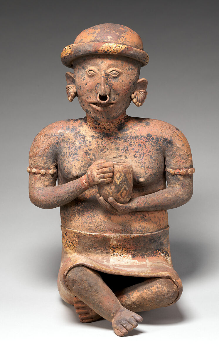 In the Nayarit region of West Mexico, nearly-identical pairs of male and female hollow ceramic figures like this one were placed in shaft tombs to accompany the dead (for this figure’s companion piece, see MMA 2005.91.2). While their gender is indicated by their dress and what each figure holds, both members of a pair are otherwise depicted as complementary in every way. Examples range greatly in size and in style, but the two figures making up each couple are remarkably similar. There are even examples known where both figures are conjoined into one ceramic piece (see MMA 1978.412.156).