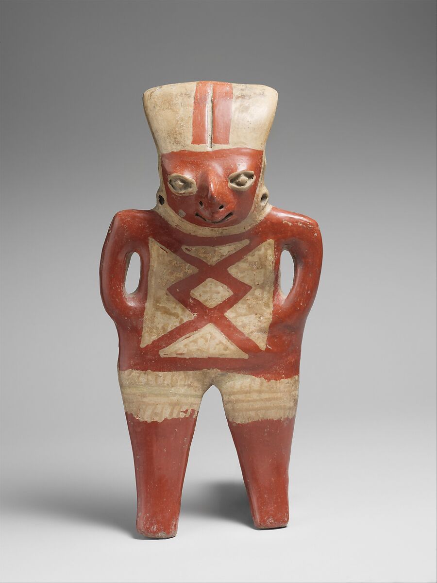 The figure wears an elaborately decorated costume. A pattern of diamond shapes and cross-hatching in white on red covers most of the front of the torso. The architectural stepped-pyramid motif outlined in white on the figure’s back may be a graphic reference to a specific place. The bold designs on both front and back, as well as the white slip on the figure’s upper legs, may represent a woven garment or body paint. Most of the lustrous bichrome ceramics and figures from Chupícuaro were recovered from funerary contexts.