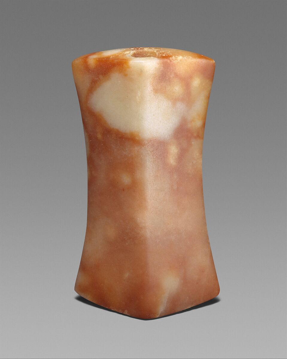 Indigenous sculptors often chose to create bannerstones out of ferruginous quartz due to its high contrast of milky white intermixed with iron minerals in shades of deep saturated oranges, reds, or pinks. This particular bannerstone is larger than most and may have been singled out for special, perhaps ceremonial performances or display. Along the edges and perforation there are little to no signs of wear, further indicating that this was a unique and particular bannerstone similar to ceremonial axes or celts made by ancient artists of North and Central America including the Olmec and Maya. On one side of the stone Fulton Co Ill. is written in black on a white label. This refers to Fulton County in Illinois, presumably where this bannerstone was found. 2011.154.15 is written in red on one end above the perforation.