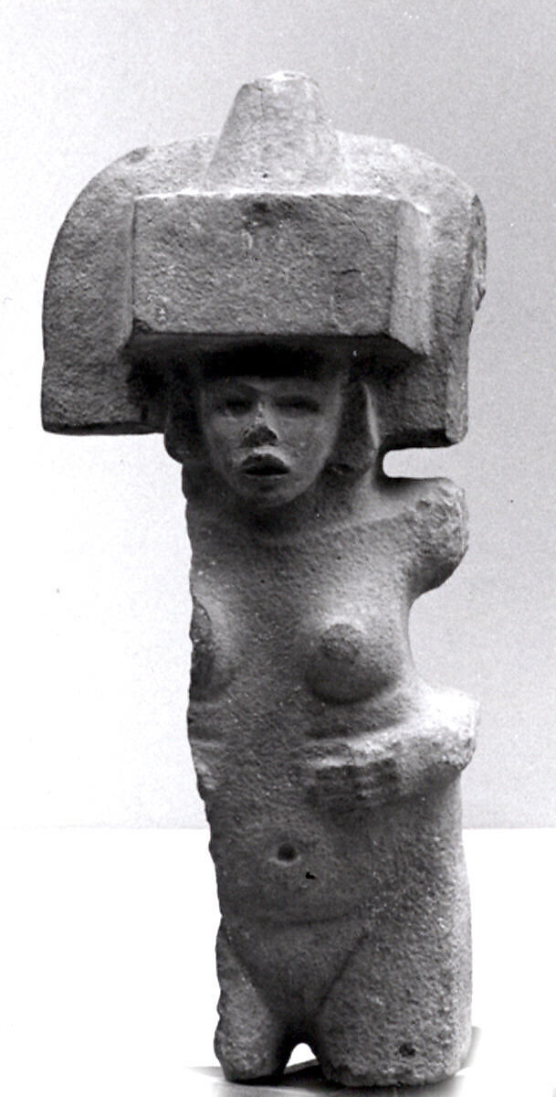 Carved sometime between the tenth and twelfth centuries, this life-size female figure is now missing much of its right side and a portion of its left arm. Despite the damage, the figure retains many of the hallmarks of Huastec stone sculpture: full lips, a linear brow, well-modeled hands positioned on the abdomen, and large voids that effectively highlight areas of mass. Exhibiting a strong emphasis on the unadorned body, the gently inclined collarbone, exposed breasts and softly rounded belly stand in marked contrast to the more elaborately decorated statues of her contemporaries along the Gulf Coast. Her large headdress—crowned by a conical top and tombstone-shaped element on the back—lends an impressive volume to the work and, along with the figure’s large belly and breasts, presents a notable departure from the sometimes flat, slablike appearance of other Huastec figures.