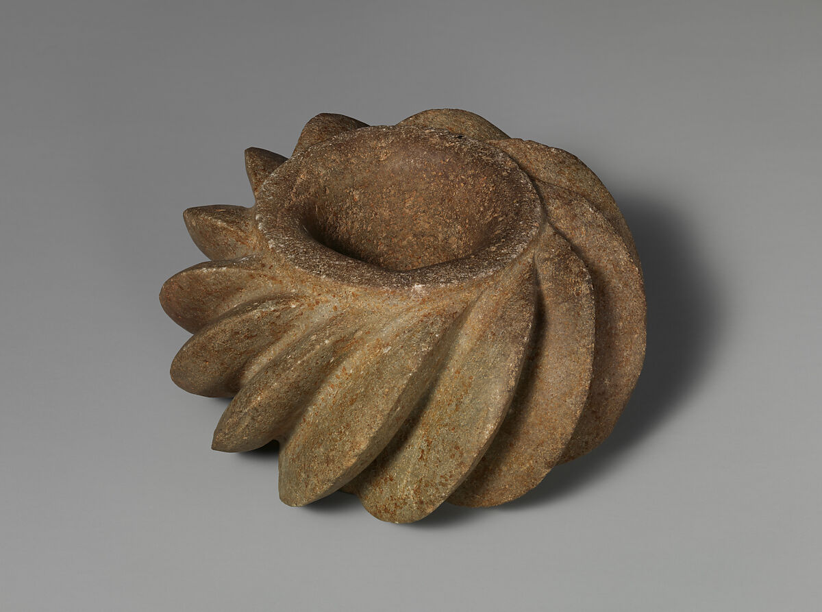 The proper cultural attribution of stone mace heads of this type is unclear. Carved stone mace heads were made as early as the middle of the first millennium BCE in the Central Andes, by artisans of the Chavín and Cupisnique cultures. A sculpted mace head was excavated from a burial at Kuntur Wasi in the northern highlands of Peru (Fux, 2013:310, cat. no. 105). Objects stylistically similar to the present mace head have been excavated from burials of the Salinar culture, which dominated Peru’s northern coastal region from 200 BCE–100 CE (Burger, 1998; Strong and Evans, 1952:55–56, pl. IIIE).