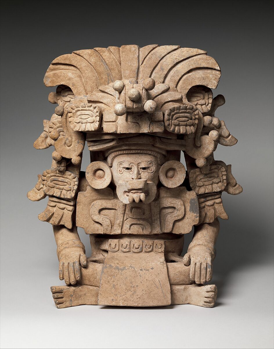 Effigy vessels such as this one were placed in groups of four or five in tombs in the Zapotec (Be'ena'a) capital of Monte Albán, Oaxaca. Similar examples, all made exclusively by the Be’ena’a people, have also been found outside the central Zapotec heartland, as far away as Teotihuacan, 500 kilometers to the north in the central highlands. Along with Zapotec-style burials, they are one sign that the Teotihuacan barrio of Tlailotlacan housed Zapotec immigrants and their descendants. The continued production over several centuries of Zapotec-style ceramics made with local materials indicates their importance as cultural markers and the barrio’s inhabitants’ ongoing desire to maintain their native traditions as a marker of ethnic identity.