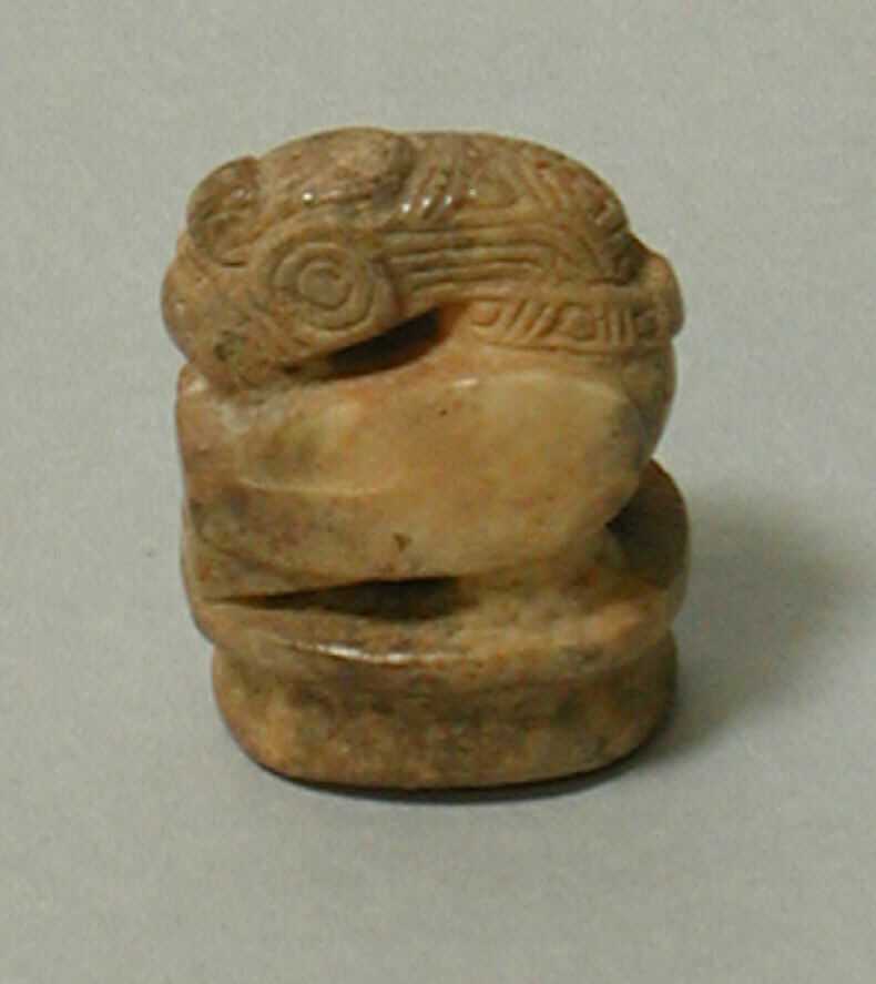 Staff heads or finials are among the more unusual objects from ancient Colombia and are functionally not well understood. They were quite common only in the Sinú region in northwestern Colombia, where they were cast in copper and gold. In the neighboring northwestern Tairona area, they are not known in metal but a few carved bone examples are said to have come from burials on the Caribbean coast. This finial features a bird standing on an oval platform. The bird has strong legs and wings that are folded on its sides. Its long neck, wearing a necklace with incised decoration, is turned back and its head, with big round eyes and curved beak, rests on its body. The head and neck are also decorated with a geometric pattern. The fleshy protuberance above the bird's beak may indicate that the bird is a condor. A hole on the underside suggests that the finial was mounted on a staff and secured with ties around its incurved base.