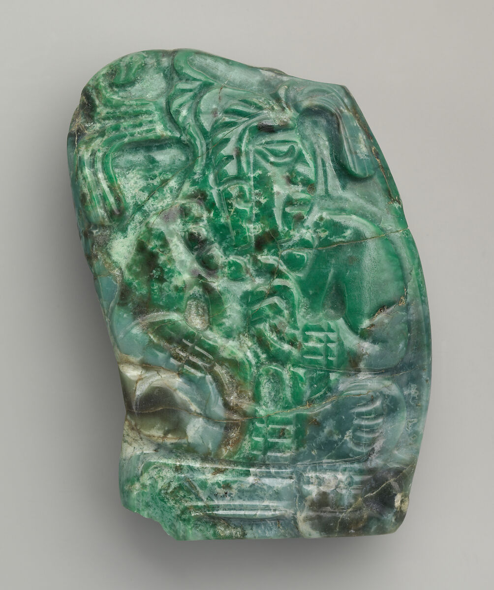 A Maya jade worker carefully sculpted this jadeite pendant to feature a seated ruler in relief on its bright green and blue-grey surface. The greenest part of the stone, the most prized for its association with maize, water, and agricultural fertility, was used for the head and torso of the royal figure. Jadeite, known as yax tuun or “blue-green stone” in the hieroglyphic language, mined from sources along the Motagua River Valley in what is now Guatemala, was a prized luxury material across ancient Mesoamerica and was used for beads, pendants, plaques, and figures for regalia and votive purposes. For example, dozens of plaques and pendants of this type were found offered into the Cenote of Sacrifice at Chichen Itza.