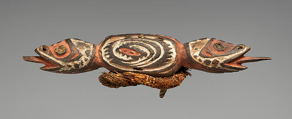 The intricate woodcarvings of the Biwat people of the Yuat River served largely as personal ornaments worn in the hair or attached to the belts or armbands of dancers. The imagery of the hair ornament seen here is strikingly similar to the hook figures (yipwon) of the Yimam people. Sepik peoples are linked by complex exchange networks, and the form of this Biwat ornament was possibly inspired by the small hook figures carried by Yimam men as hunting charms. In addition to the decoration of the human body, Biwat artists created a variety of ornaments to adorn sacred flutes such as small flute stoppers, which originally served to seal the upper end of a hollow bamboo flute.