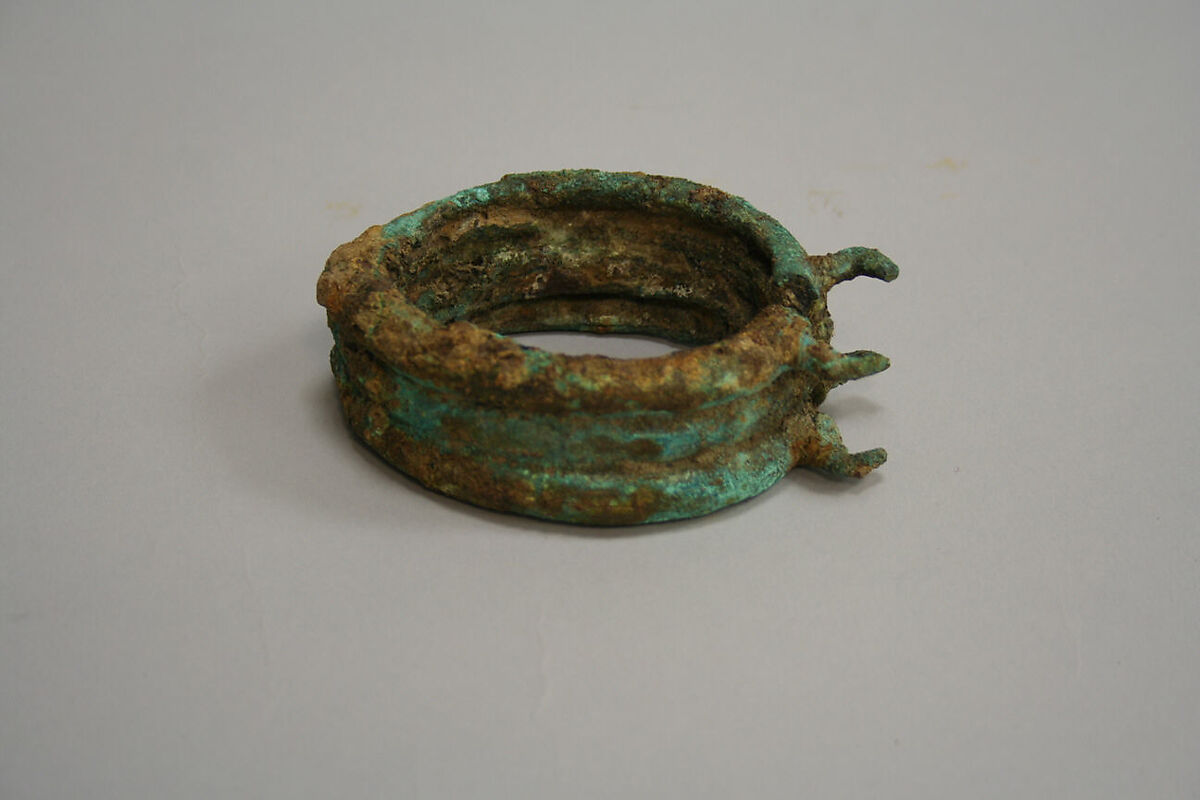 The Sao civilization developed over a millennium on the borders of Lake Chad, with the earliest settlements dating to the seventh century. Despite extensive archaeological research, details about its rise and fall remain unknown. Culture groups who succeeded the Sao appropriated some of their artistic traditions and propagated legends about these powerful predecessors. Most works have been found in dwelling, ritual, and funerary sites, as well as in areas identified as metallurgic workshops. Clay, iron, and copper were the media of choice for the Sao. They created animal and human figurines imbued with protective properties, and personal adornments such as rings, bracelets, and pendants. Made using the lost-wax technique, sand casing, and hammering, they demonstrate the Sao’s metalsmithing expertise and their rich and inventive iconography.