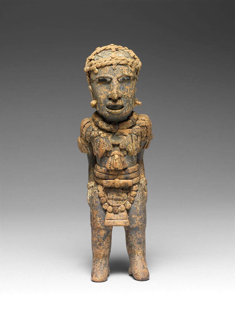 The modern state of Veracruz lies along the Mexican Gulf Coast, north of the Maya lowlands and east of the highlands of central Mexico. Culturally diverse and environmentally rich, the people of Veracruz took part in dynamic interchanges between the three regions that over the centuries included trade, warfare, and migration. During the middle centuries of the first millennium, the artistically gifted Veracruzanos created particularly inventive ceramic sculpture in diverse yet related styles. Each of these three standing figures is unique, but they share many details: the curled hair (or hats with curls) with traces of white coloring, the barlike chest ornaments, the projecting ear ornaments, and the elaborate belts or loincloths. The wide mouths are open to show off sparkling teeth that have been blackened with hematite crystals, which are rare on Veracruz ceramic figures. The black pupils of the wide eyes, on the other hand, are a resinous material called chapapote that is not uncommon on Veracruz figures. The varying details on the costumes give the figures an odd appearance of rank, as if they were performers of some kind or military men in dress uniform. It is a narrative note unusual among groups of ceramic figures of this period.
