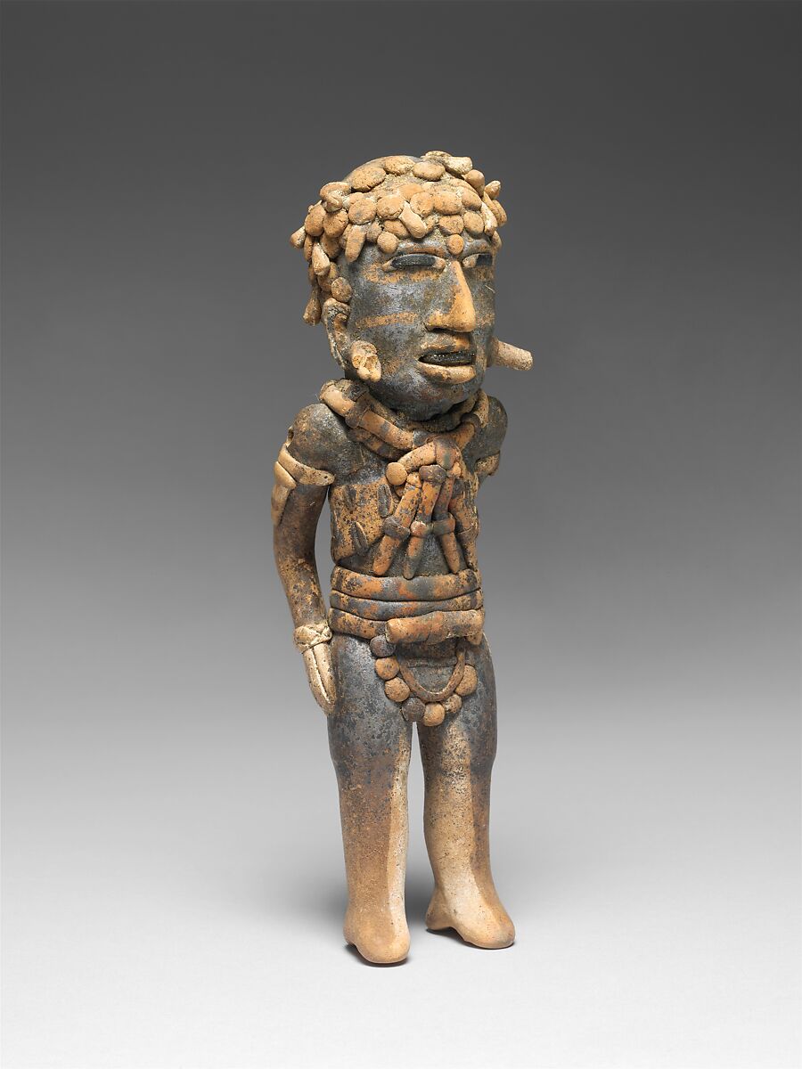 The modern state of Veracruz lies along the Mexican Gulf Coast, north of the Maya lowlands and east of the highlands of central Mexico. Culturally diverse and environmentally rich, the people of Veracruz took part in dynamic interchanges between the three regions that over the centuries included trade, warfare, and migration. During the middle centuries of the first millennium, the artistically gifted Veracruzanos created particularly inventive ceramic sculpture in diverse yet related styles. Each of these three standing figures is unique, but they share many details: the curled hair (or hats with curls) with traces of white coloring, the barlike chest ornaments, the projecting ear ornaments, and the elaborate belts or loincloths. The wide mouths are open to show off sparkling teeth that have been blackened with hematite crystals, which are rare on Veracruz ceramic figures. The black pupils of the wide eyes, on the other hand, are a resinous material called chapapote that is not uncommon on Veracruz figures. The varying details on the costumes give the figures an odd appearance of rank, as if they were performers of some kind or military men in dress uniform. It is a narrative note unusual among groups of ceramic figures of this period.
