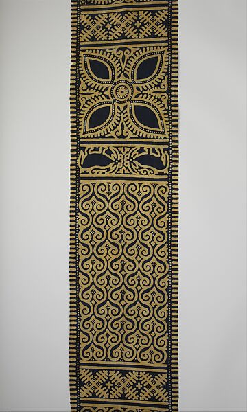 Among the Toraja people of Sulawesi Island in Indonesia, each family owns a variety of sacred textiles. One of the most versatile types is the sarita, a long, narrow cloth used in diverse ways, depending on ritual context and local tradition. During some rites, the Sa'dan Toraja, in the northern highlands, hang sarita from the gables of the ancestral clan house (tongkonan) as ceremonial banners. The Sa'dan and the Mamasa Toraja, in the eastern part of the district, use sarita in rituals connected both with the east (associated with life, vitality, and fertility) and the west (associated with death and funerary rites). In one fertility rite, a circle of eight women are united physically and supernaturally by a sarita draped around their shoulders. At funerals, sarita can be worn as headcloths by prominent people, placed on the dead, or used to dress the tau-tau, a wooden effigy representing the deceased. In the Kulawi area, sarita serve as festive garments, worn as waistcloths by men or stitched together to form voluminous women's skirts. The geometric motifs on sarita resemble the design carved on the wood facades of tongkonan and rice barns. The stylized water buffalo on this example, the most prestigious animal for ritual sacrifices, symbolizes the owners' high social status.