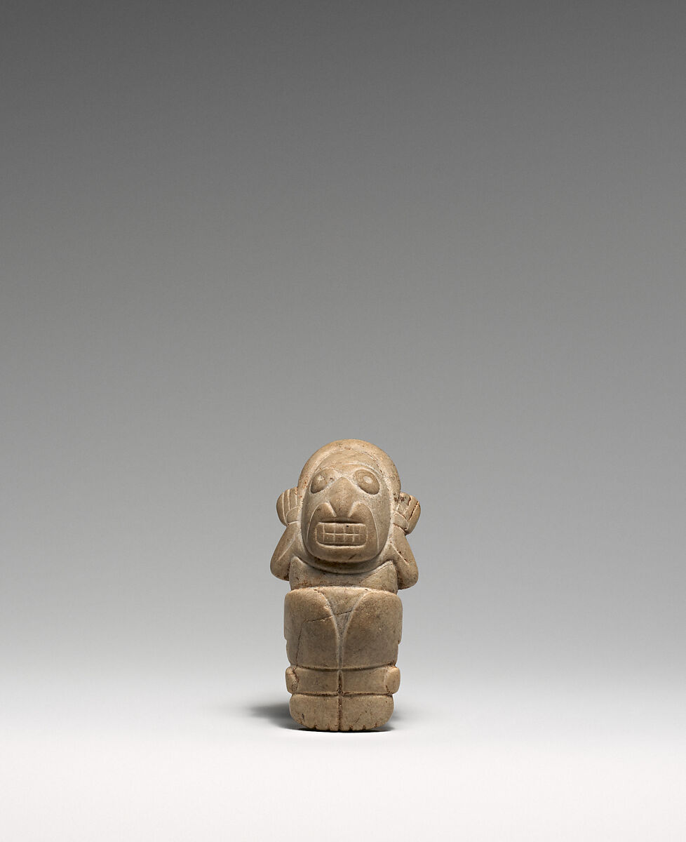 This stone pendant, worn by Taíno leaders and healers, features a crouching anthropomorphic figure known as a zemí. Zemí (or cemí) is a term used by Taíno peoples, the diverse societies that inhabited the Antilles archipelago before European contact, that linguistically relates to a quality akin to sweetness. Zemí refers not to an object or image but to an immaterial, spiritual, and vital force pertaining to deities and ancestors. There are several known zemí identities recorded by the Spanish, some of which have been linked to archaeological images.