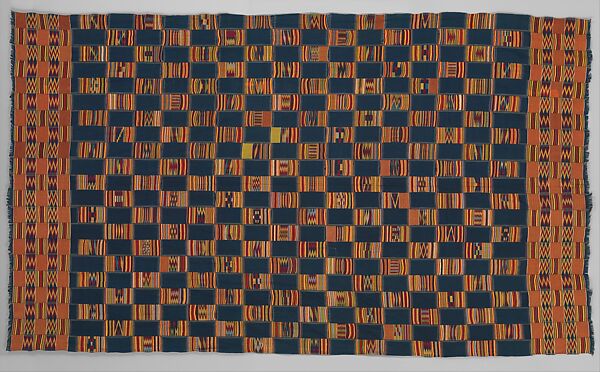 Brilliantly colored and elaborately woven textiles known as kente are worn by individuals of distinction throughout the Asante society. Monumental kente wrappers are created from a long and narrow loom-woven cloth that is cut at specific intervals. These are sewn together to form a large panel composed of as many as twenty-four bands. The intricate designs characteristic of these textiles are individually named and may be reserved for the exclusive use of the king or other high-ranking officials.