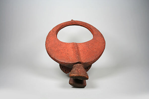 South of the Jos plateau, the northernmost part of the Middle Benue Valley Region, headdresses such as this example are collectively identified as mangam. Worn during events directed at securing agricultural success, promoting healing, and marking rites of passage, they were part of a ritual complex bearing the same name. The full costume that hid the wearer’s body consisted of a dress of layered palm leaves, the upper-layer of which was attached directly to the holes along the mask's lower rim.