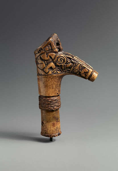 This handle for a sword (Mandau) from northern Borneo is carved from deer antler. A grip of plaited fiber covers the shaft. The handle has a projecting spur adorned with intertwining curvilinear motifs and terminates in the head of an aso — a protective dragon-like creature with long snout, curving boar-like tusks and a curling nose shown in low relief. The tip of the spur which aligns with the eye of the aso, the top of the short pommel, and upper portion of the spur all have holes drilled into them, originally intended for the insertion of decorative tufts of animal hair.